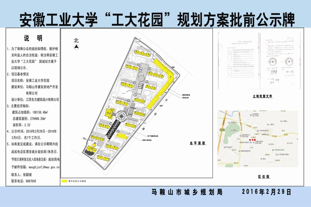 2 月29日上午 ,项目建筑规划方案通过市规划局审查。与此同时,安徽工业大学“工大花园”规划方案进行了批前公示。