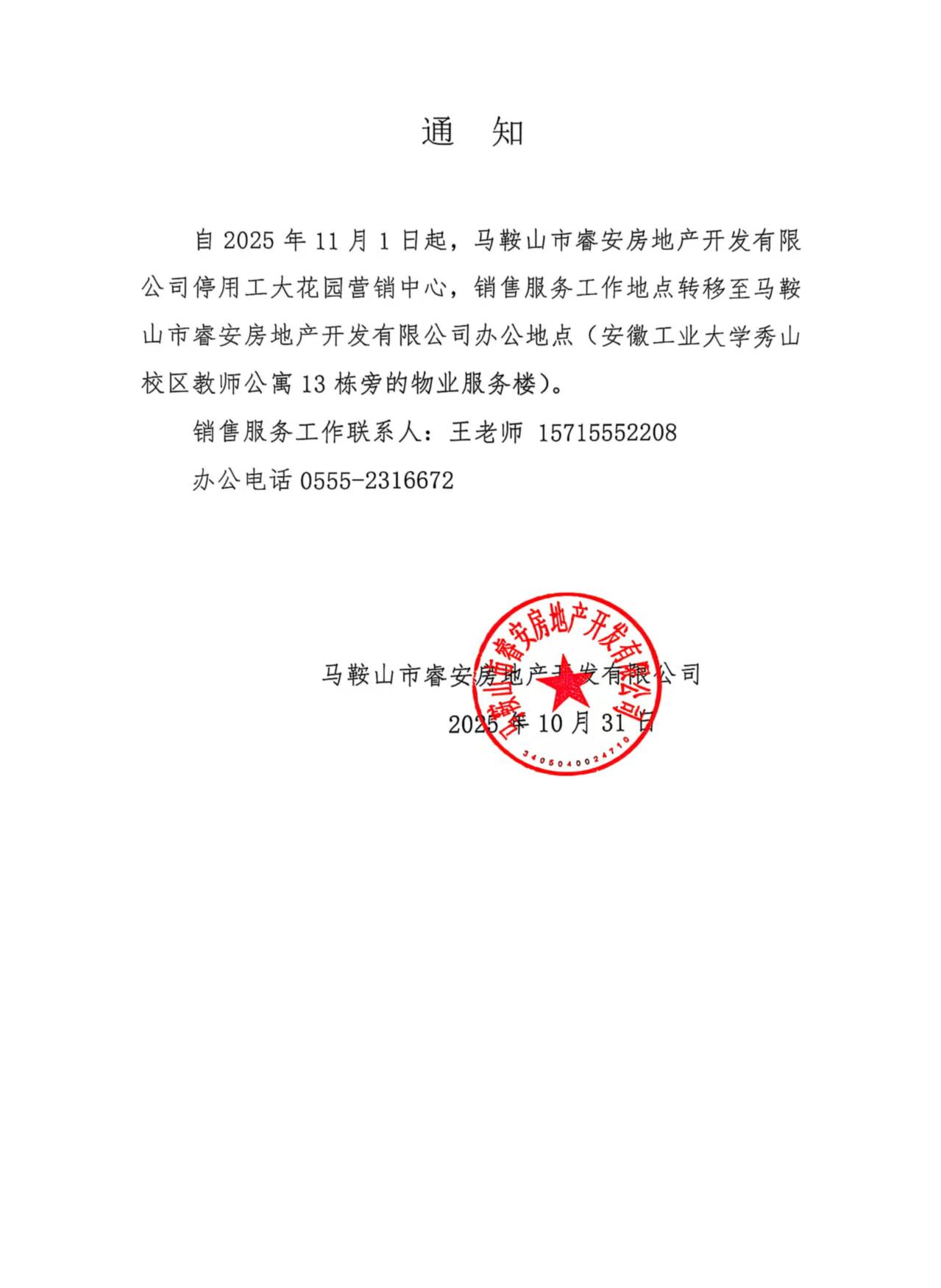 马鞍山市睿安房地产开发有限公司 地址:安徽省马鞍山市安徽工业大学秀山校区教师公寓物业用房